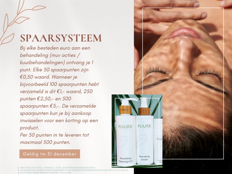 Bij elke genoten behandelingen (muv acties, kortingen en kuurbehandelingen) spaart u automatisch mee.